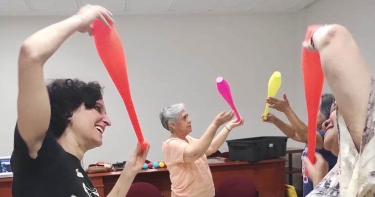 Capacitación especializada para el trabajo con personas mayores desde el juego corporal, el movimiento y la risa. Se exploran técnicas circenses adaptadas que estimulan la memoria, el equilibrio, la coordinación y el sentido de pertenencia.